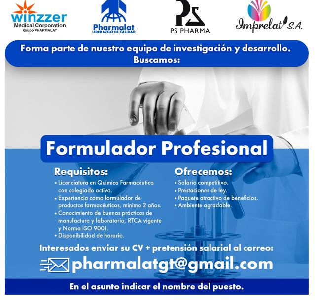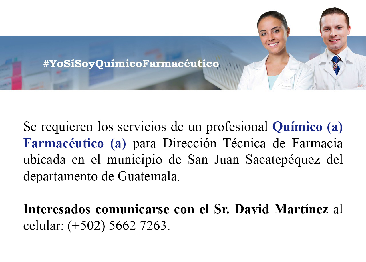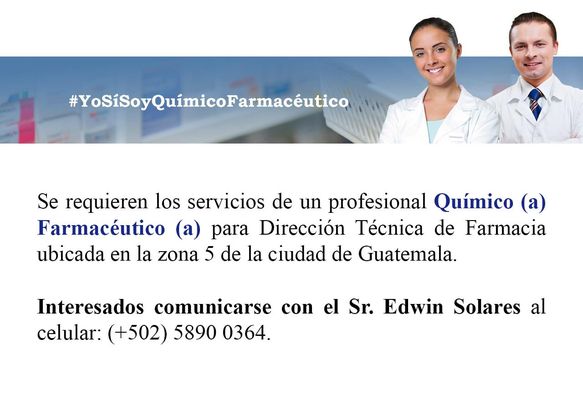 Oferta laboral para Químico (a) Farmacéutico (a) para dirección técnica de Farmacia ubicada en Mixco, Guatemala.
