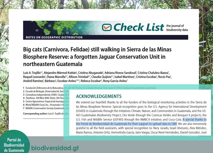 Publicación enfocada en la conservación de grandes felinos en Sierra de las Minas (autores: Luis Trujillo, Bárbara Escobar, Rony García, entre otros)
