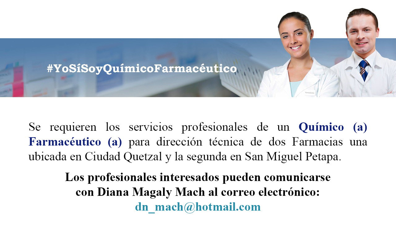 Oportunidad laboral para Químico (a) Farmacéutico (a) Dirección Técnica de dos Farmacias en el departamento de Guatemala.