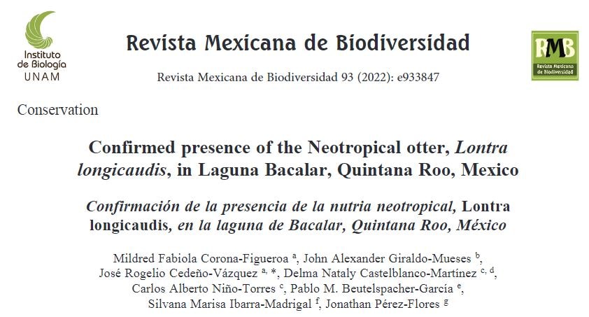 Articulo “Confirmación de la presencia de la nutria neotropical, Lontra longicaudis, en la laguna de Bacalar, Quintana Roo, México”, a cargo de la bióloga guatemalteca Fabiola Corona.