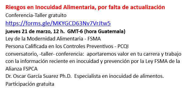 Conferencia-Taller gratuito: Riesgos en Inocuidad Alimentaria, por falta de actualización.