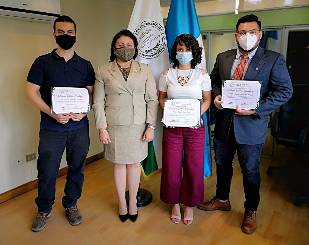 Guatemala 10 de abril de 2021. Tres destacados estudiantes universitarios fueron reconocidos con el premio “Olimpia Altuve Rodríguez” del Colegio de Farmacéuticos y Químicos de Guatemala -COFAQUI- en el marco de la conmemoración del aniversario de la Facultad de Ciencias Químicas y Farmacia de la Universidad de San Carlos de Guatemala. Este año, la Junta Directiva 2019/2021 acordó reconocer a tres estudiantes por obtener los mejores promedios de notas en el año de cierre de pensum y entregarles un incentivo económico de Q 1 mil a cada uno.