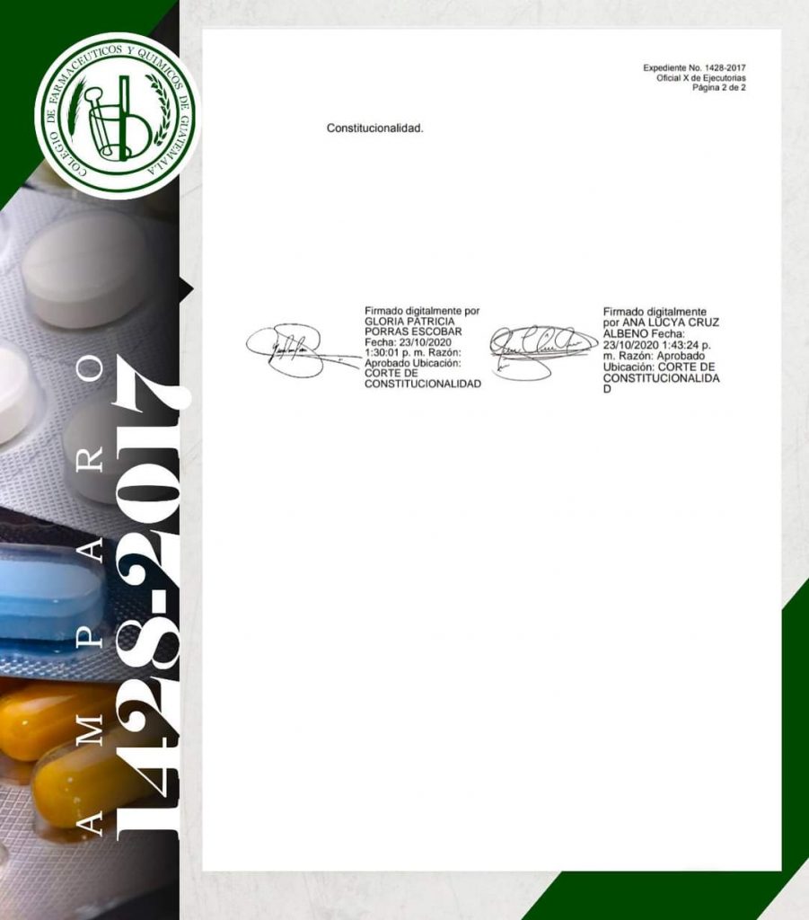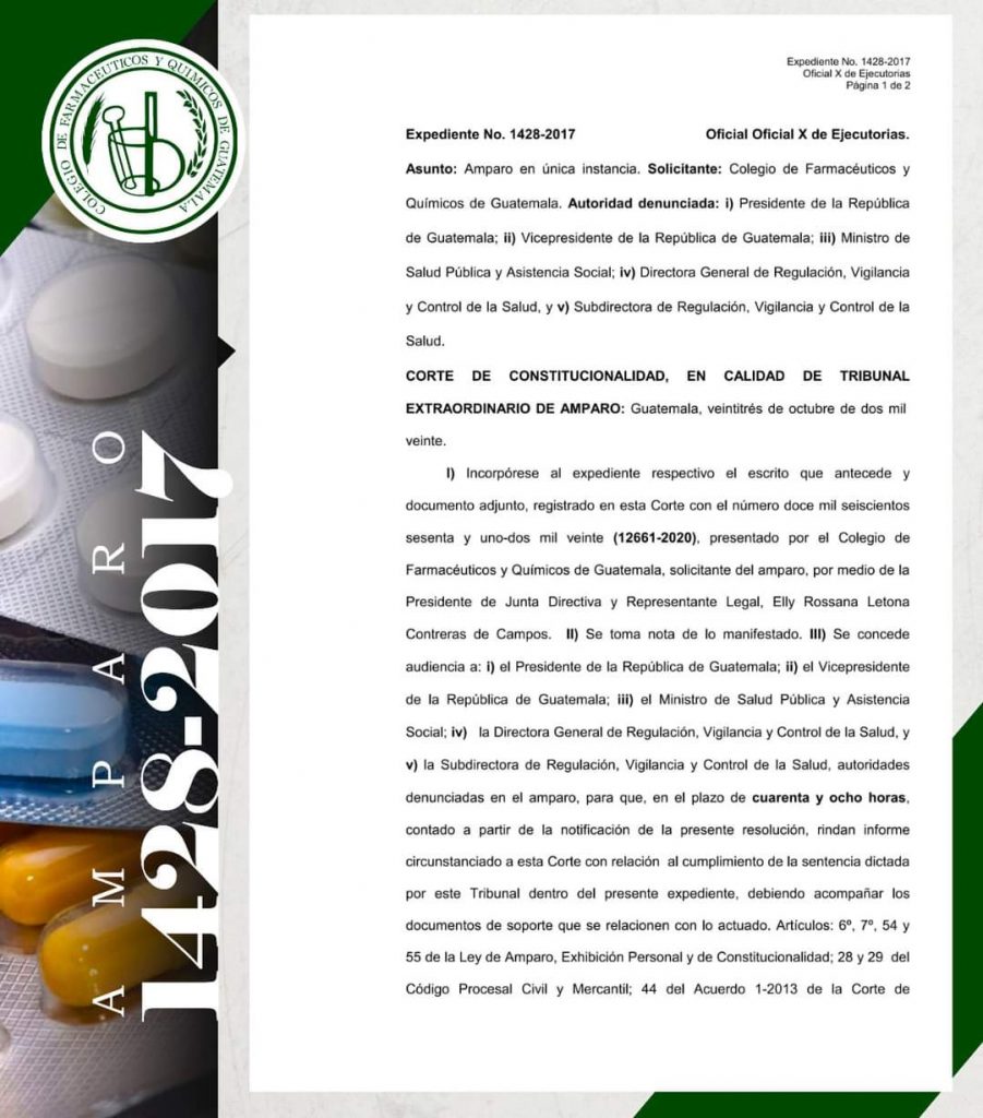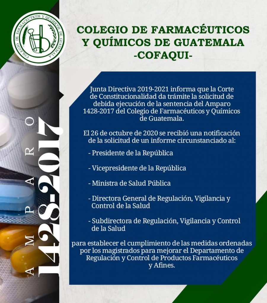 La Corte de Constitucionalidad -CC- dio trámite a la solicitud del Colegio de Farmacéuticos y Químicos de Guatemala -COFAQUI- para la debida ejecución de la sentencia del amparo 1428-2017, una acción legal que busca que se reestablezca y mejore el funcionamiento del Departamento de Regulación y Control de Productos Farmacéuticos y Afines del Ministerio de Salud Pública, tras el incendio de sus instalaciones en enero de 2017. El pasado lunes 26 de octubre el COFAQUI fue notificado sobre el seguimiento del trámite, indicando que fueron requeridos informes circunstanciados sobre las acciones realizadas por la sentencia emitida en julio, la cual establece que las autoridades denunciadas debían emitir las ordenes necesarias para garantizar el funcionamiento del DRCPFA. Esta acción permitirá a los magistrados evaluar el cumplimiento o incumplimiento de la sentencia.