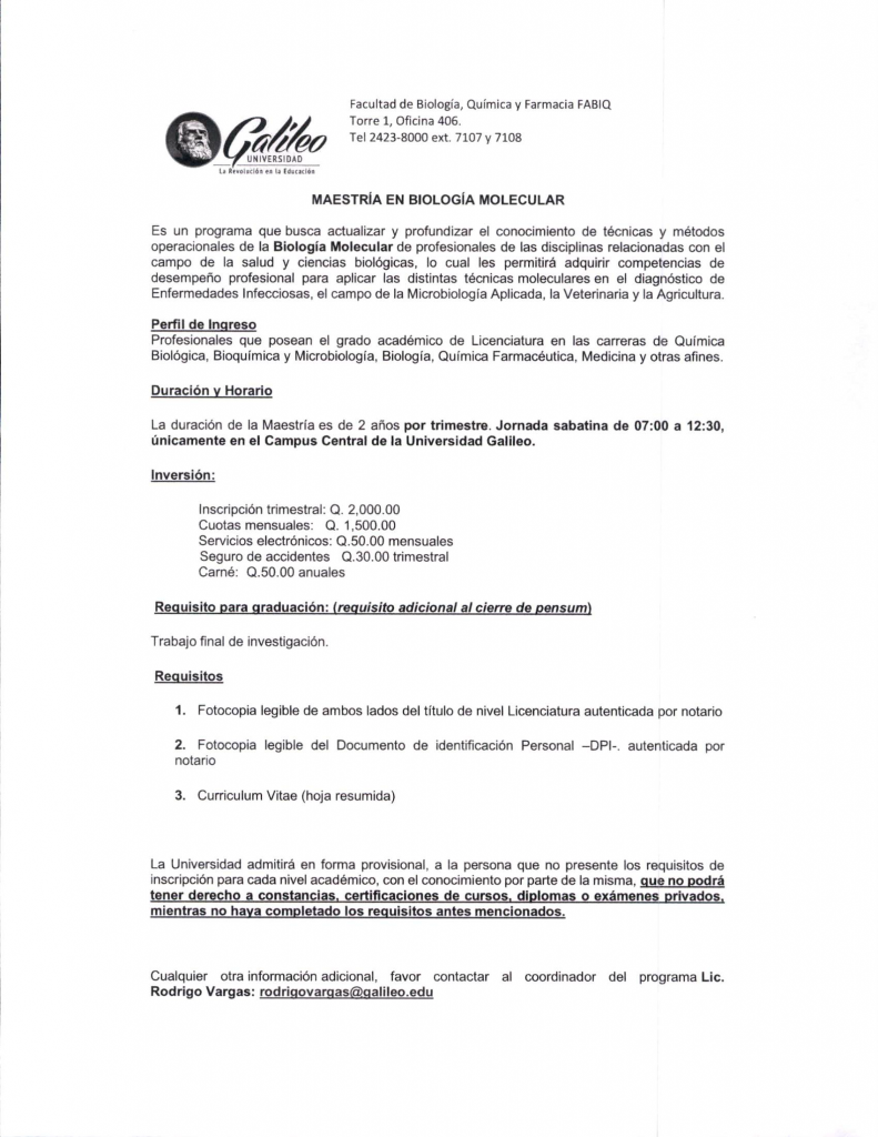 Maestría en Biología Molecular de la FABIQ de Universidad Galileo