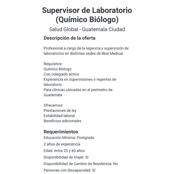Oferta laboral para Químico (a) Biólogo (a) para dirección técnica de Laboratorio Clínico en Chiquimula.
