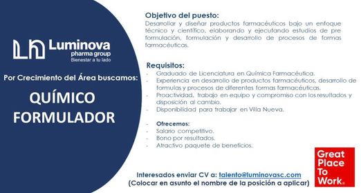 Oferta labora para Químico (a) Farmacéuticos (a) para puesto de Químico Formulador