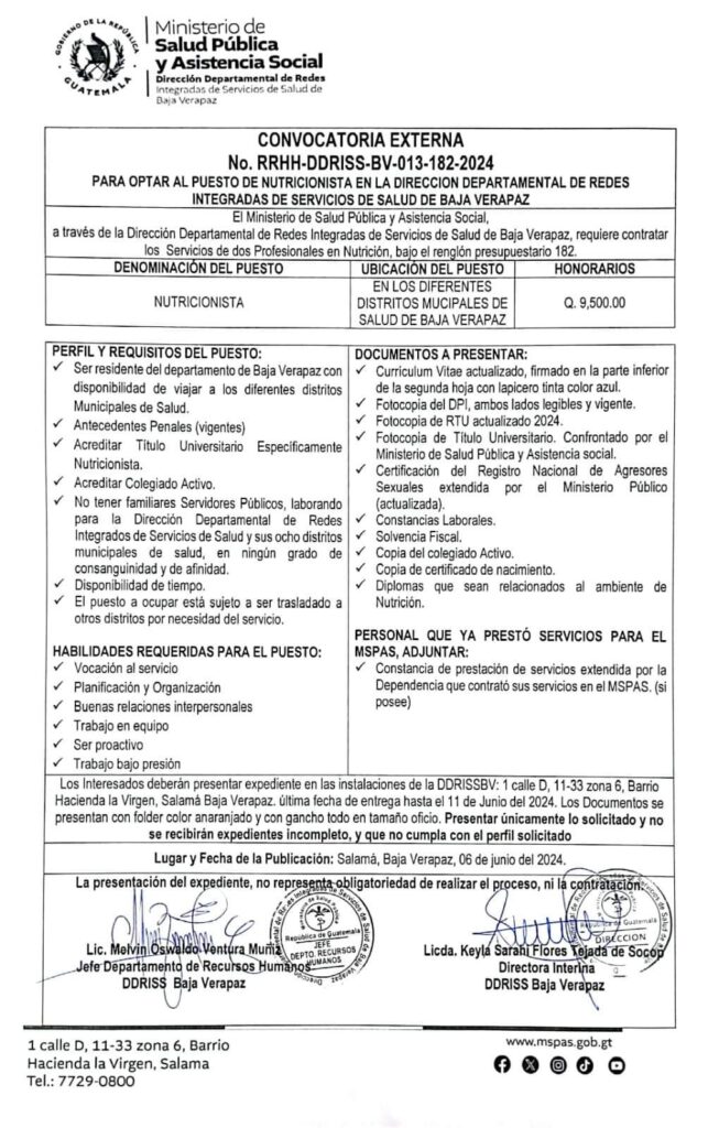 Oferta laboral para Nutricionista por parte del MSPAS.