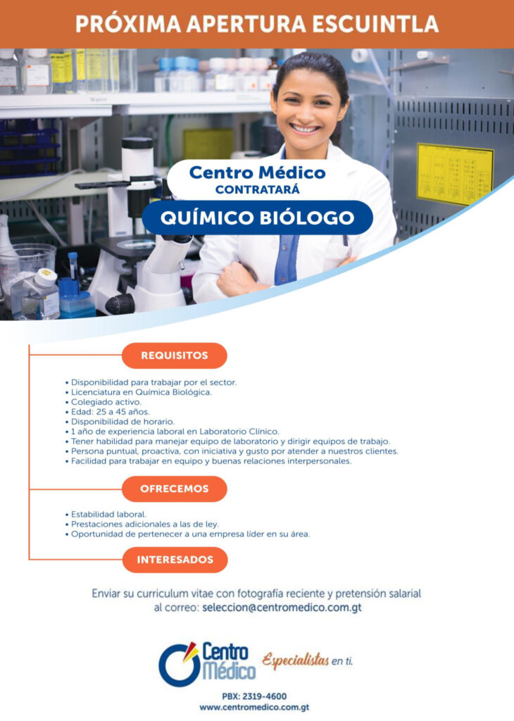 Oferta laboral para Químico (a) Biólogo (a) para Centro Médico, sede Escuintla