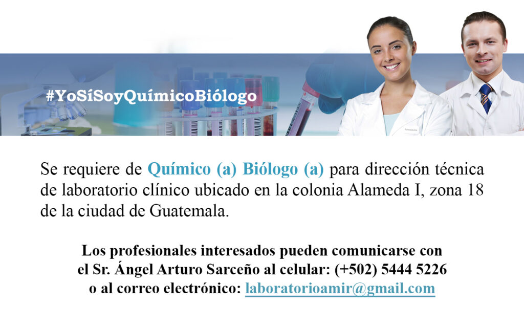 Oferta laboral para Químico (a) Biólogo (a) para dirección técnica de laboratorio clínico en la ciudad de Guatemala.
