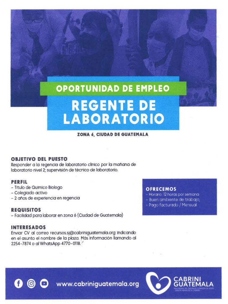 Oferta laboral para Químico (a) Biólogo (a) para Director Técnico de Laboratorio Clínico en zona 6, Ciudad de Guatemala.
