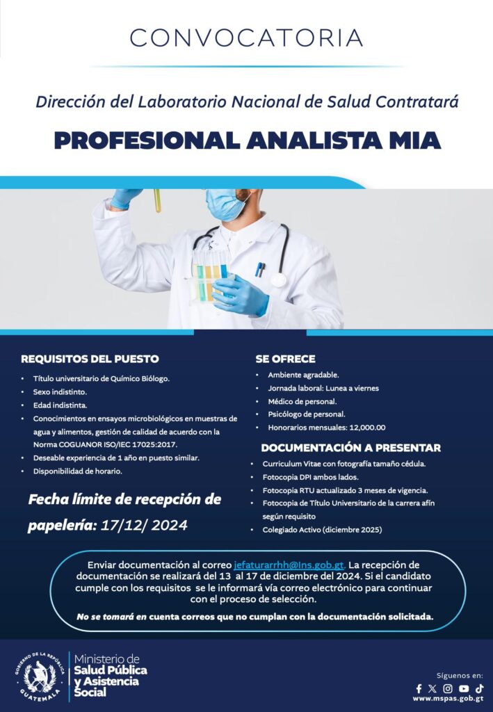 Oferta laboral para Químico (a) Biólogo (a) para profesional analista mia del Laboratorio Nacional de Salud