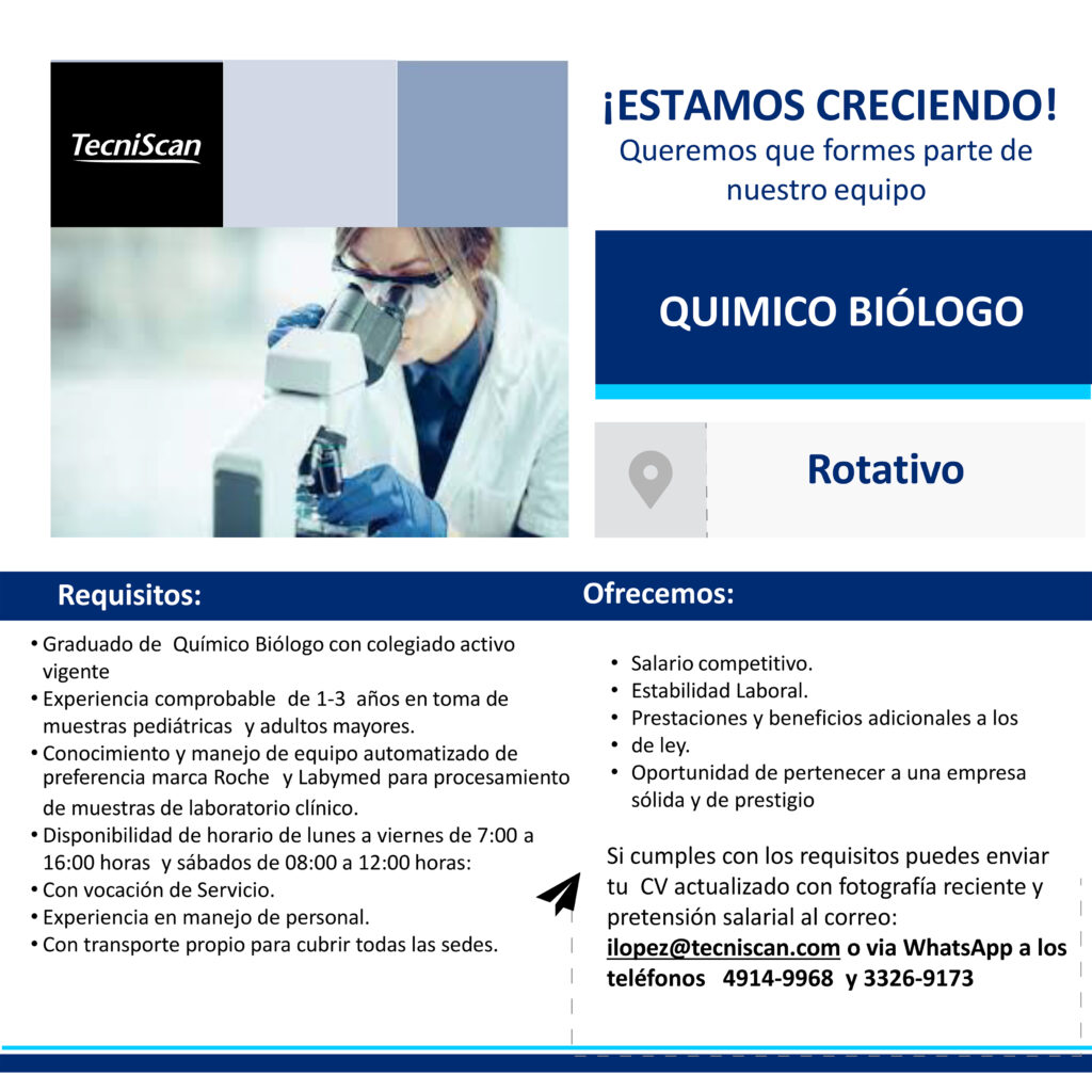 Oferta laboral para Químico (a) Biólogo (a) para Tecniscan, turnos rotativos.