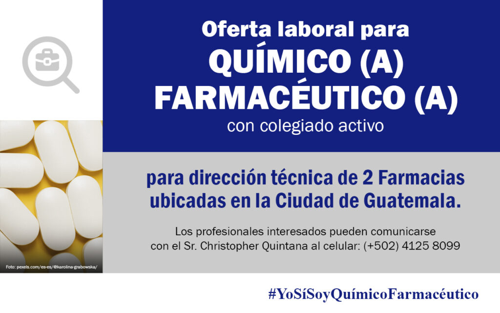 Oferta laboral para Químico (a) Farmacéutico (a) para 2 direcciones técnicas de Farmacia en la Ciudad de Guatemala.
