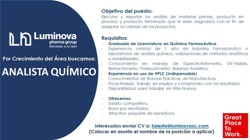 OFerta laboral para Químico (a) Farmacéutico (a) para analista químico