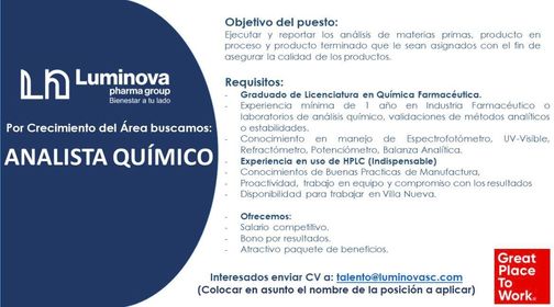 Oferta laboral para Químico (a) Farmacéutico (a) para Analista Químico