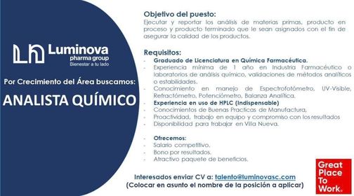 Oferta laboral para químico (a) farmacéutico (a) para analista químico