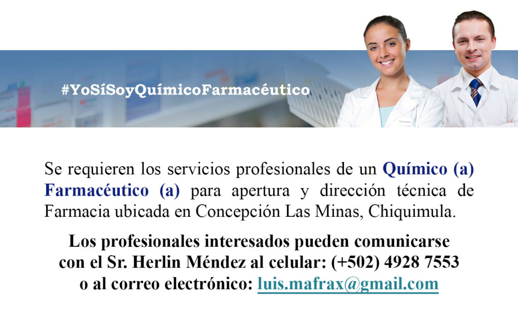 Oferta laboral para Químico (a) Farmacéutico (a) para apertura y dirección técnica de Farmacia en Chiquimula.