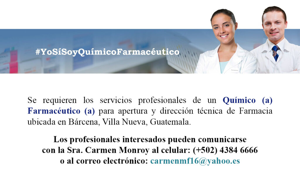 Oferta laboral para Químico (a) Farmacéutico (a) para apertura y dirección técnica de Farmacia en Villa Nueva.