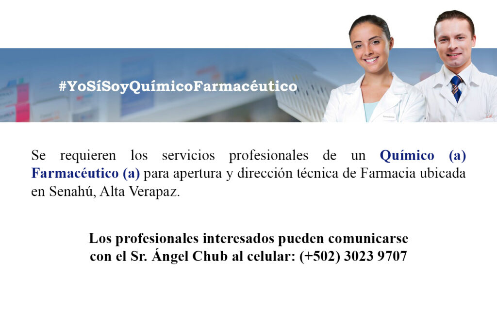 Oferta laboral para Químico (a) Farmacéutico (a) para apertura y dirección técnica de Farmacia ubicada en Alta Verapaz.