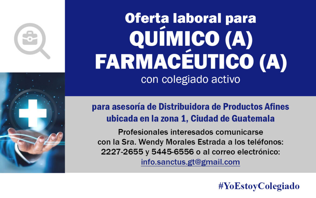 Oferta laboral para Químico (a) Farmacéutico (a) para asesoría de Distribuidora en la Ciudad de Guatemala.