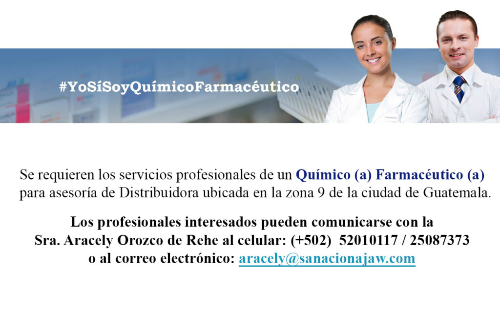 Oferta laboral para Químico (a) Farmacéutico (a) para asesoría de Distribuidora en zona 9, Guatemala.