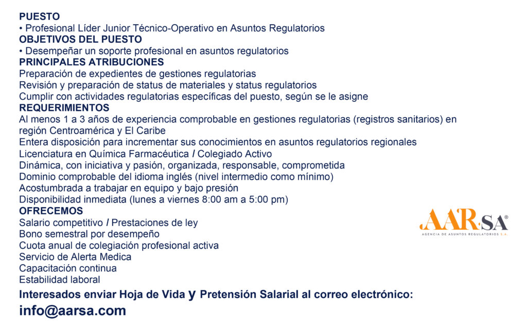 Oferta laboral para Químico (a) Farmacéutico (a) para Asuntos Regulatorios.