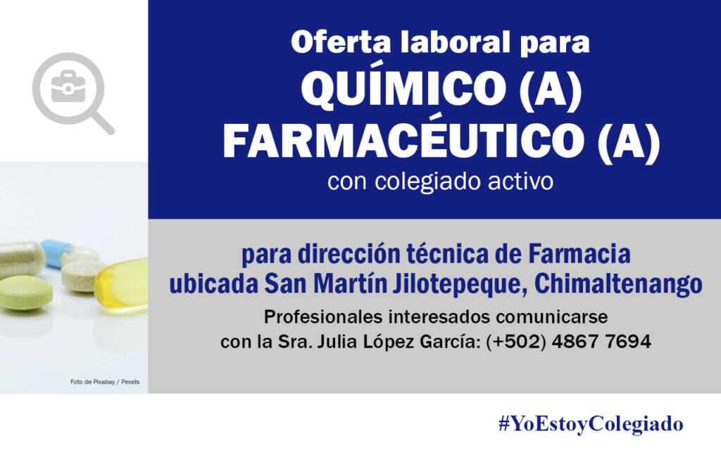 Oferta laboral para Químico (a) Farmacéutico (a) para dirección técnica de Farmacia en Chimaltenango.