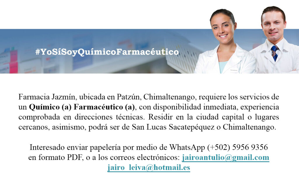 Oferta laboral para Químico (a) Farmacéutico (a) para dirección técnica de Farmacia en Chimaltenango.