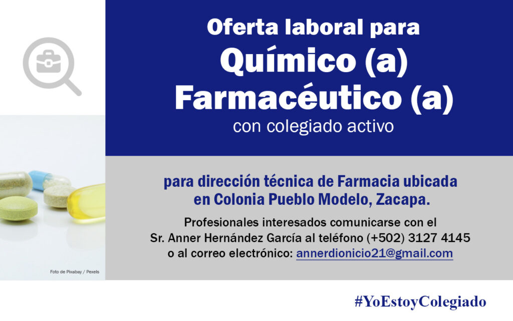 Oferta laboral para Químico (a) Farmacéutico (a) para dirección técnica de Farmacia en Colonia Pueblo Modelo, Zacapa.