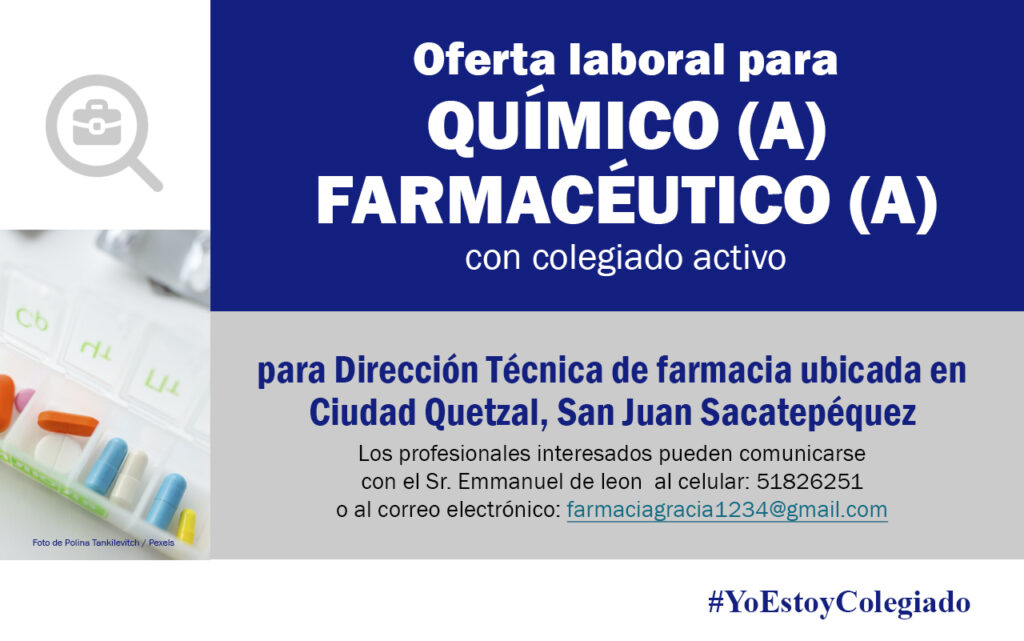Oferta laboral para Químico (a) Farmacéutico (a) para dirección técnica de Farmacia en San Juan Sacatepéquez.