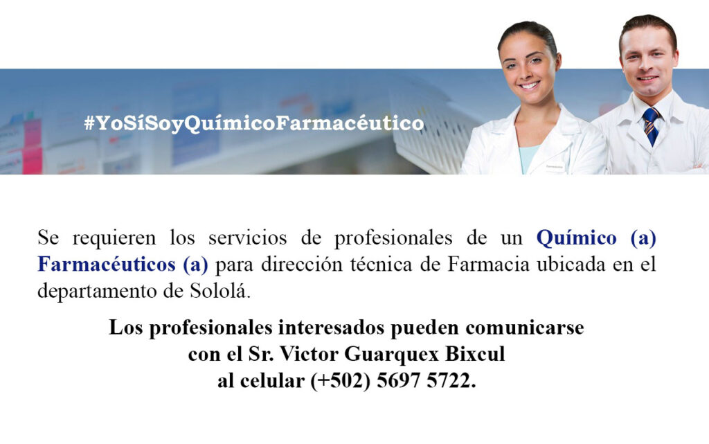 Oferta laboral para Químico (a) Farmacéutico (a) para dirección técnica de Farmacia en Sololá.