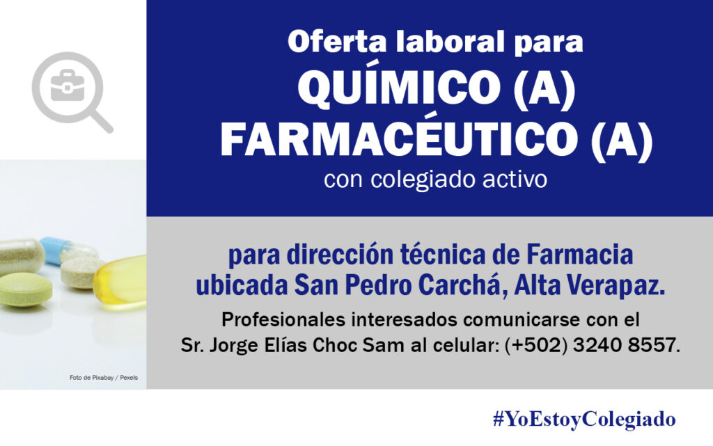 Oferta laboral para Químico (a) Farmacéutico (a) para dirección técnica de Farmacia ubicada en Alta Verapaz.