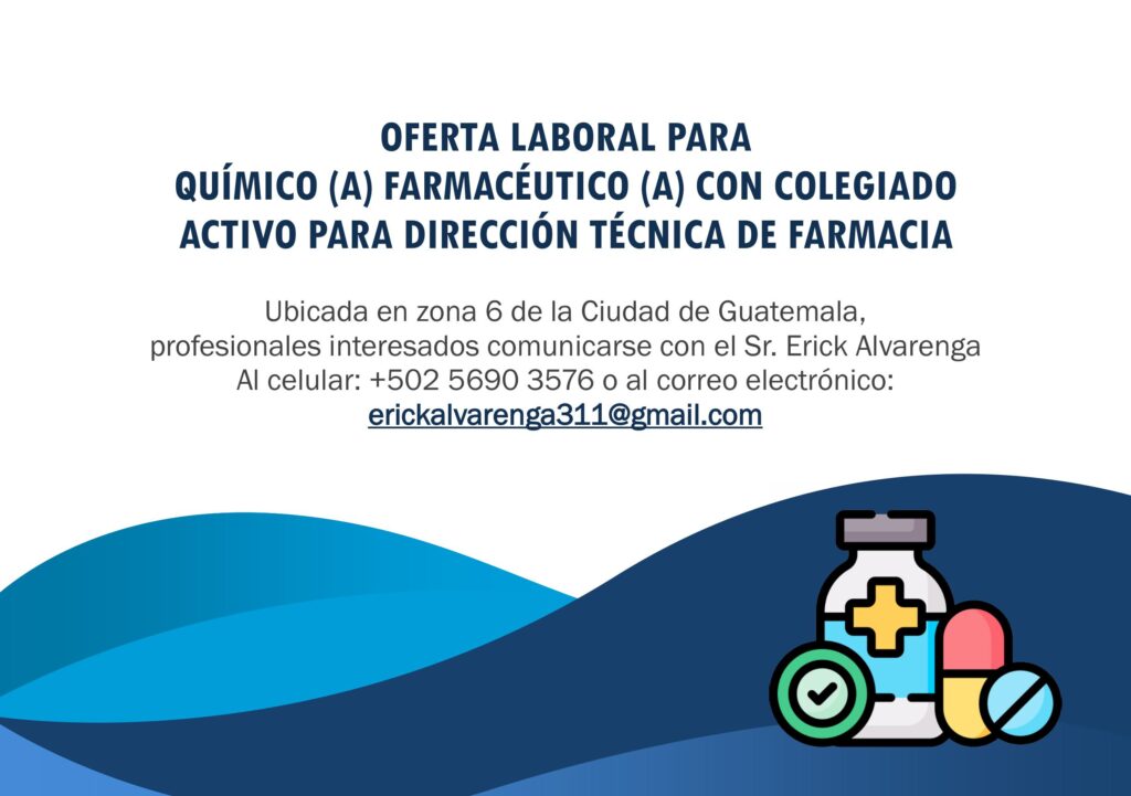 Oferta laboral para Químico (a) Farmacéutico (a) para dirección técnica de Farmacia ubicada en Ciudad de Guatemala.