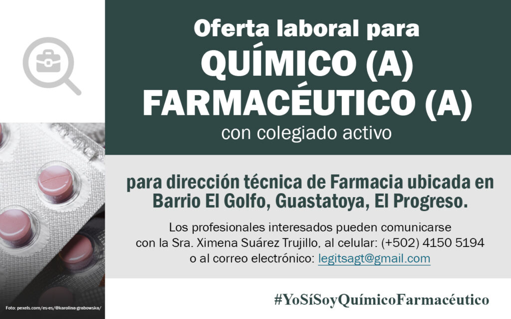 Oferta laboral para Químico (a) Farmacéutico (a) para dirección técnica de Farmacia ubicada en El Progreso.