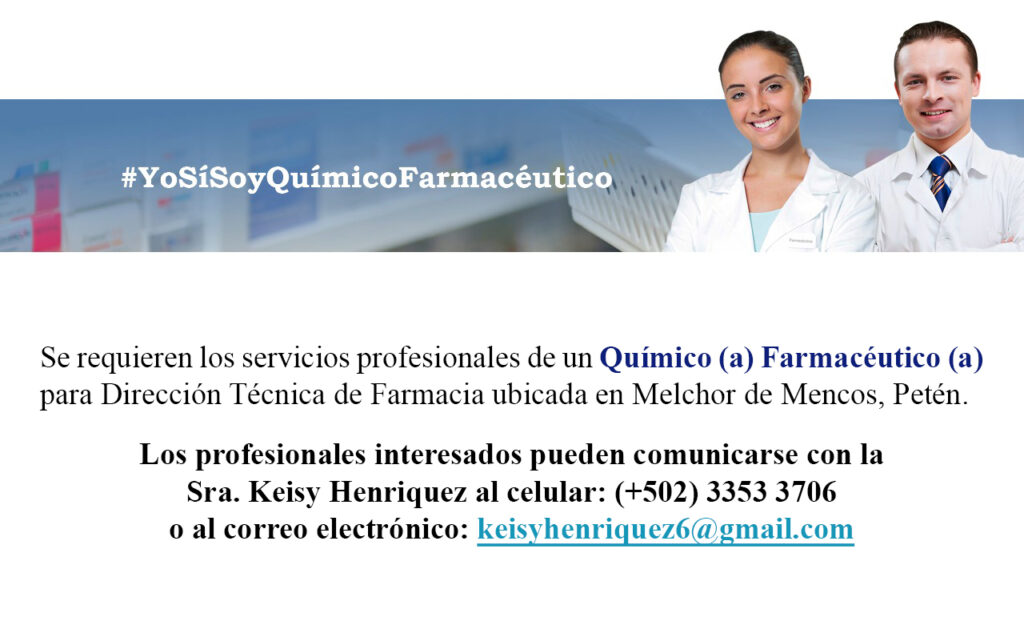 Oferta laboral para Químico (a) Farmacéutico (a) para Dirección Técnica de Farmacia ubicada en Petén.