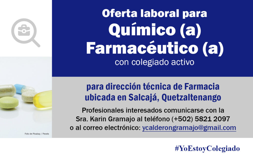 Oferta laboral para Químico (a) Farmacéutico (a) para dirección técnica de Farmacia ubicada en Quetzaltenango