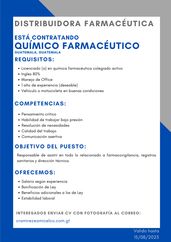 Oferta laboral para Químico (a) Farmacéutico (a) para Distribuidora Farmacéutica.