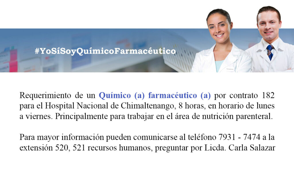 Oferta laboral para Químico (a) Farmacéutico (a) para el Hospital Nacional de Chimaltenango.