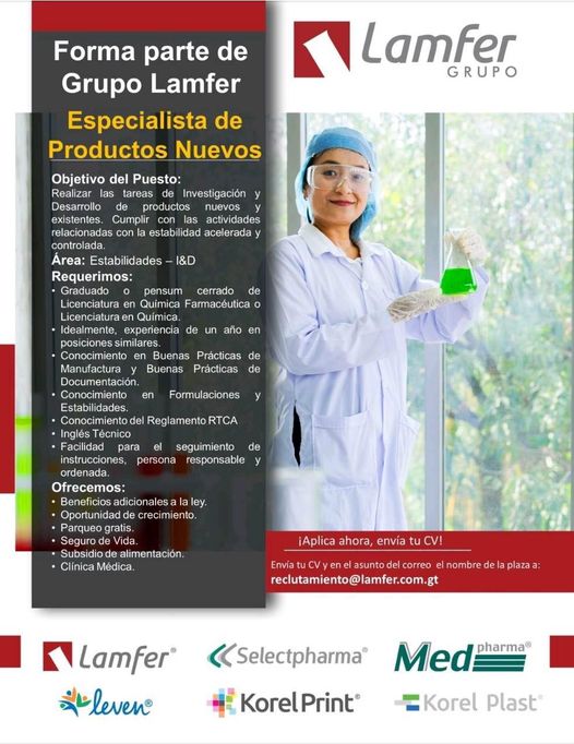 Oferta laboral para Químico (a) Farmacéutico (a) para especialista de productos nuevos