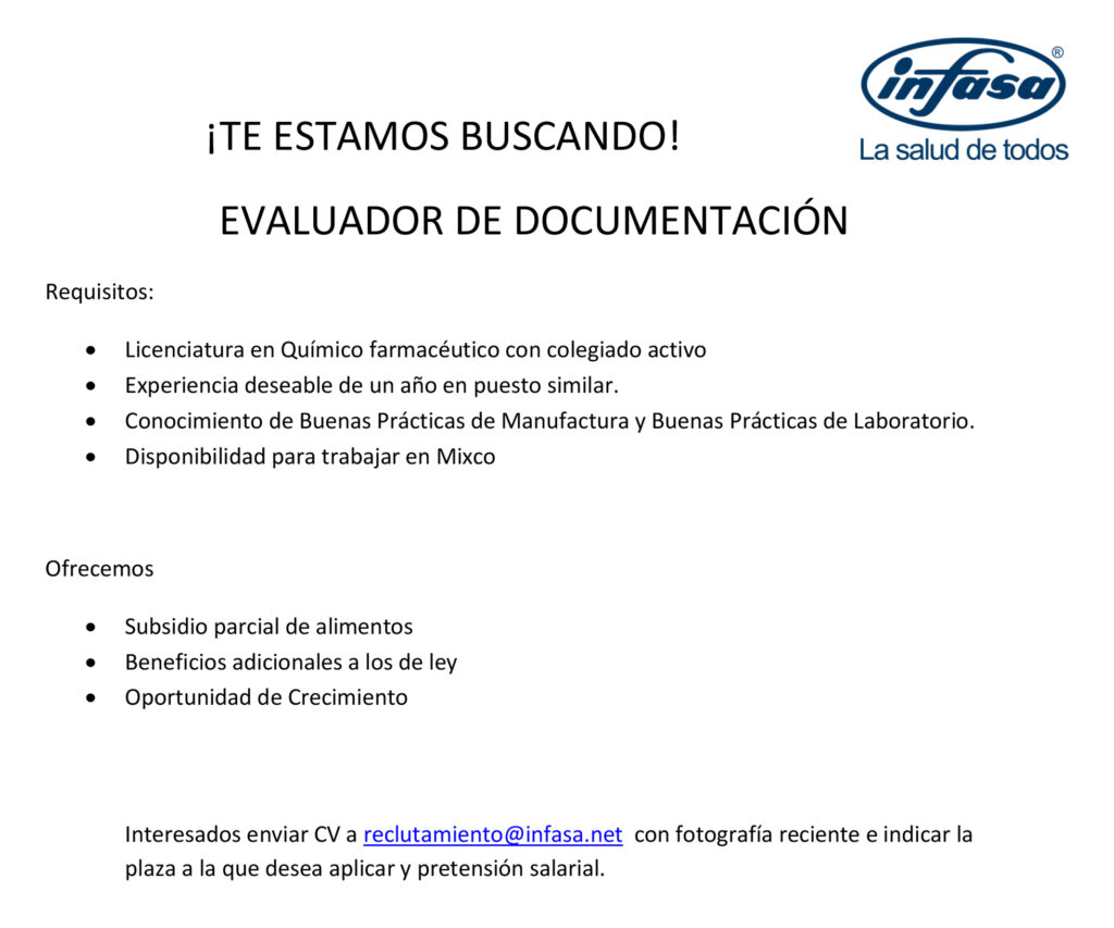 Oferta laboral para Químico (a) Farmacéutico (a) para Evaluador de Documentación