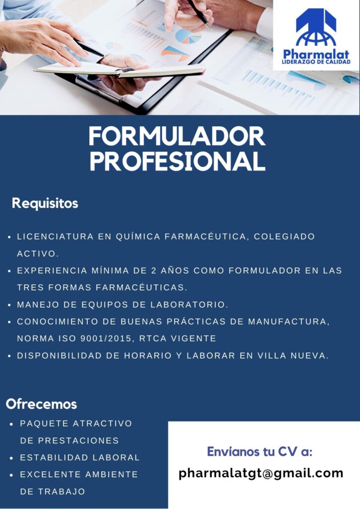 Oferta laboral para Químico (a) Farmacéutico (a) para Formulador Profesional.