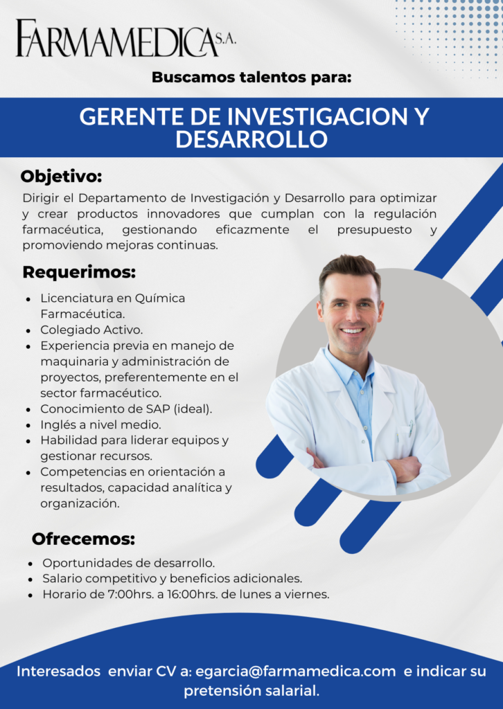 Oferta laboral para Químico (a) Farmacéutico (a) para Gerente de Investigación y Desarrollo