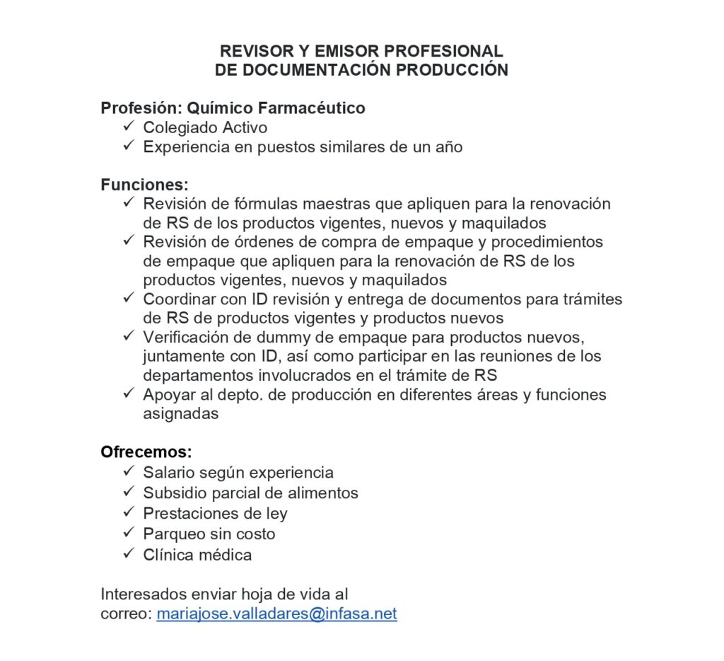 Oferta laboral para Químico (a) Farmacéutico (a) para Revisor y Emisor Profesional de Documentación Producción.