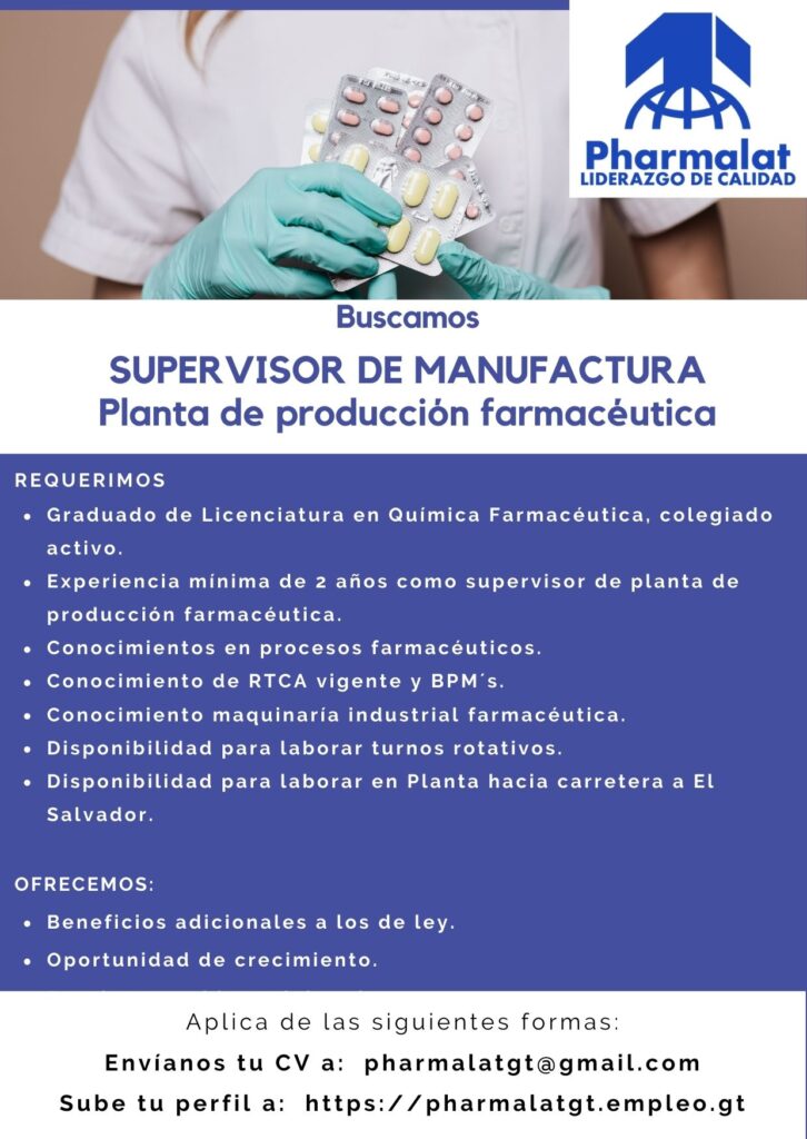 Oferta laboral para Químico (a) Farmacéutico (a) para Supervisor de Manufactura.