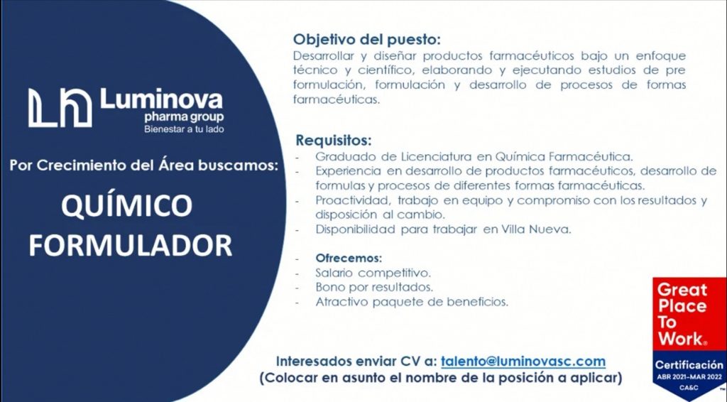 Oferta laboral para Químico (a) Formulador (a)
