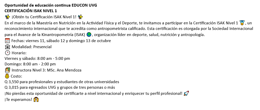 Oportunidad de educación continua EDUCON UVG CERTIFICACIÓN ISAK NIVEL 1