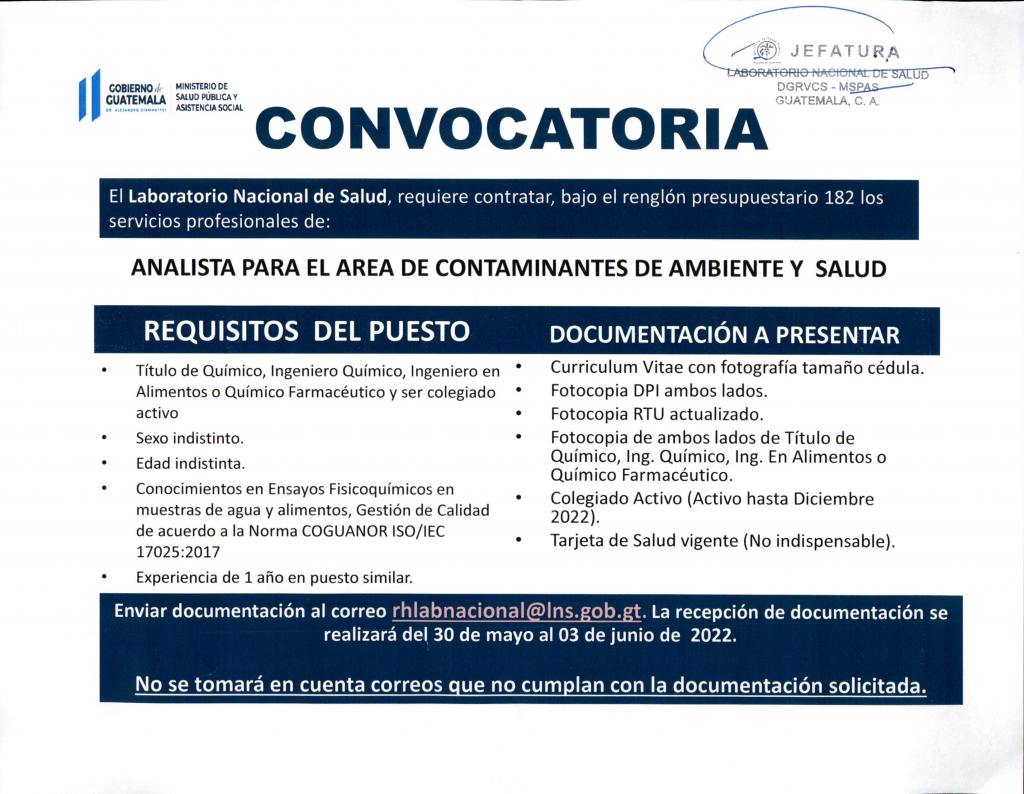 Oportunidad laboral para Analista para el área de Contaminantes de Ambiente y Salud por parte del LNS.