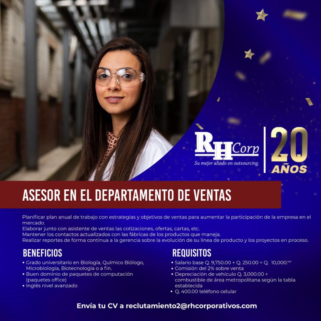 Oportunidad Laboral para carreras afines para Asesor en el Departamento de Ventas.