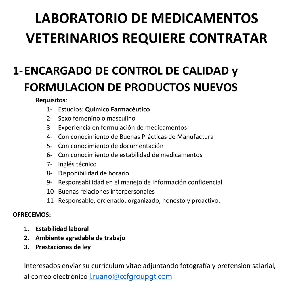 Oportunidad laboral para Control de Calidad y Formulación de Productos Nuevos.