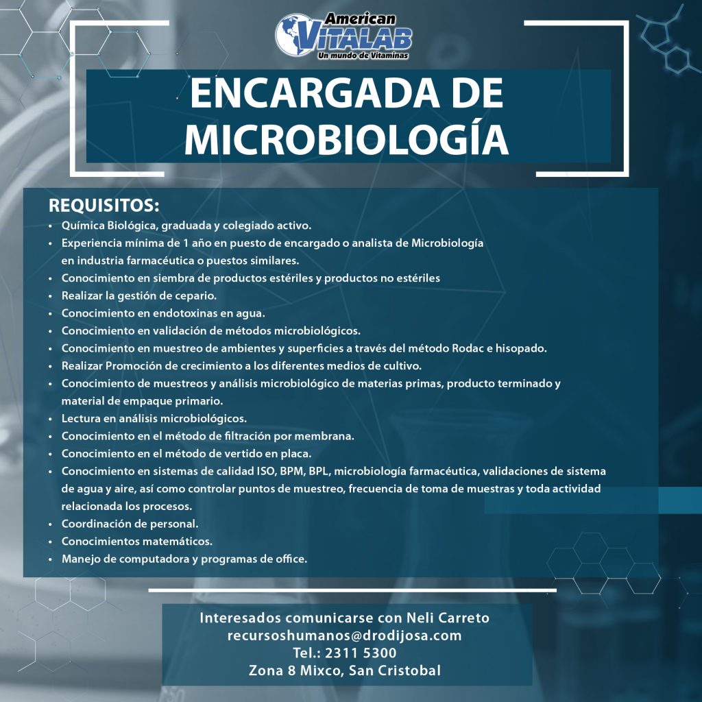 Oportunidad laboral para Química Bióloga para Encargada de Microbiología.
